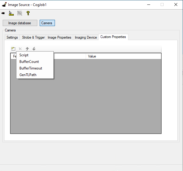 The Custom Features pane allows to read and write values to Features. These features are not GenICam features, but some parameters used in the context of the adapter.