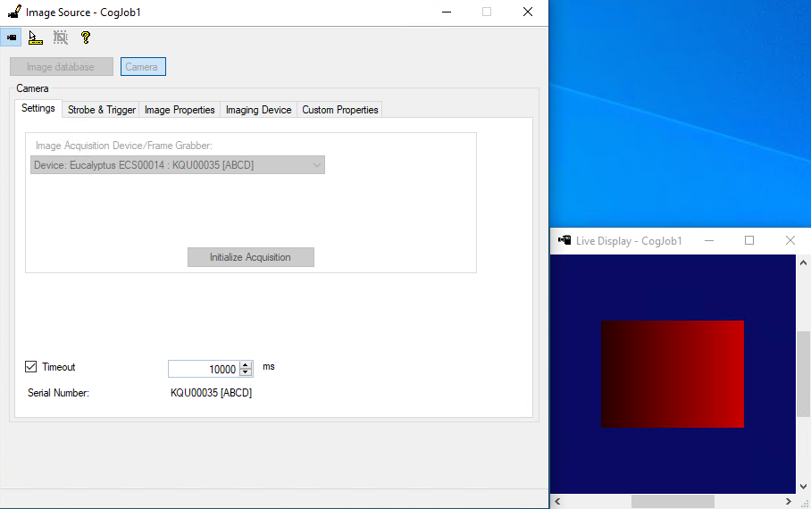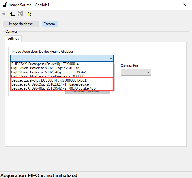 To use a device, the user should select it and then click on Initialize Acquisition. This initializes the eGrabber object and allows the user to acquire images and use it in .