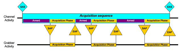 An acquisition sequence is a succession of acquisition phases. Each acquisition phase corresponds to a period of time when a channel uses a grabber to accept an individual image from a camera, and to deliver it to the destination cluster.