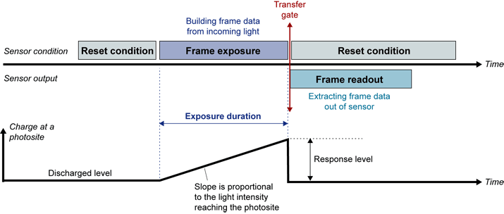 Let us consider the case of an area-scan camera equipped with a CCD sensor of the interline transfer or frame transfer type. It is useful to consider two successive conditions: frame exposure, followed by frame readout.