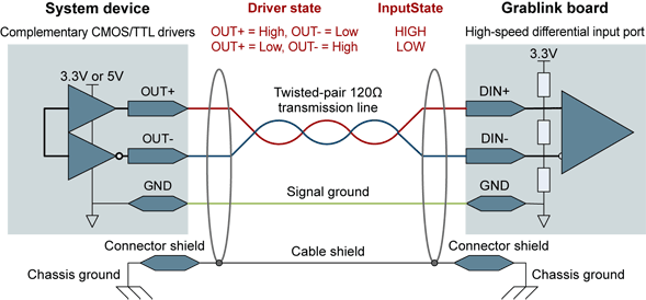 The following figure shows the recommended wiring diagram for a system device using two complementary CMOS or TTL drivers. Applicable for fast system devices such as motion encoders operating at frequencies up to 5 MHz