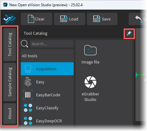 The new Open eVision Studio graphical user interface (GUI) is organized as follows: