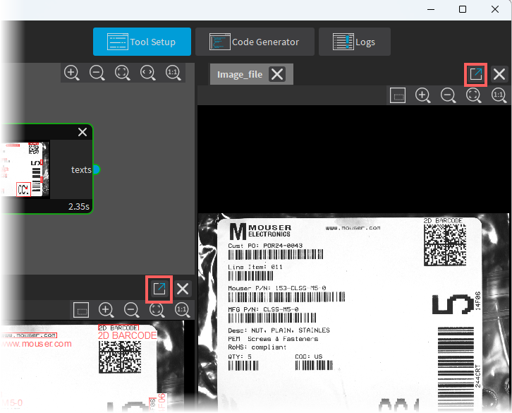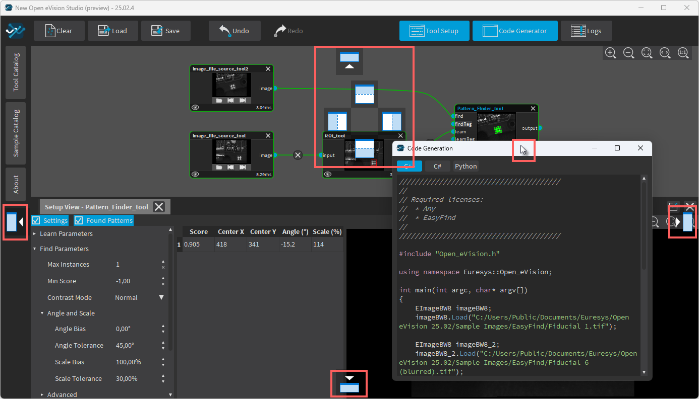 Additional panes such as the Code Generator, Logs and image panes of the tools... |