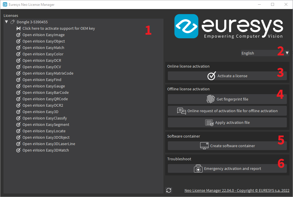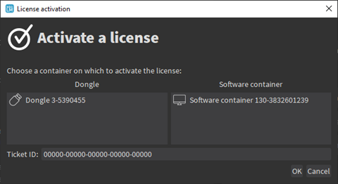 The software container is now available in the license activation dialogs and in the main license list (area 1 in the main window). |