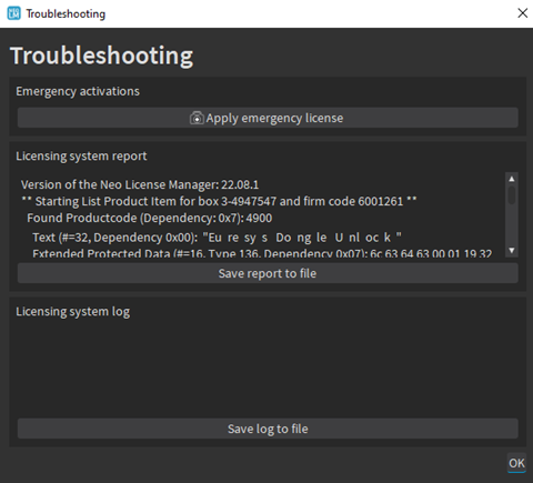 Click on the Save log to file button to generate a licensing system log and save it to a file. |