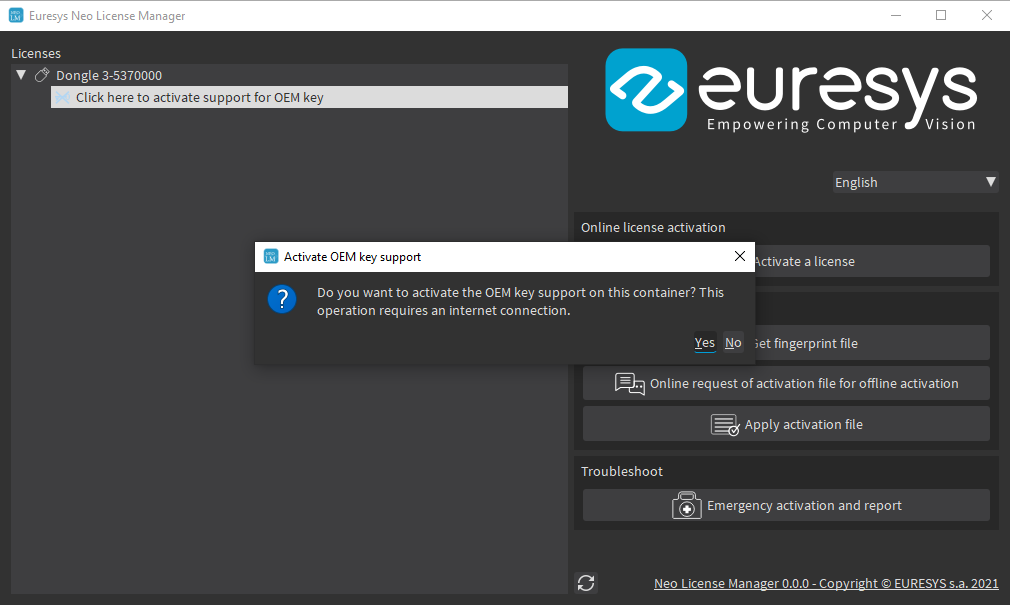 If there is no software license container yet, create one from the main window before opening the license activation dialog.