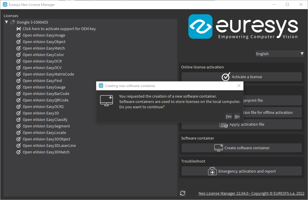 Click on the Yes button to confirm the creation of the software container. |