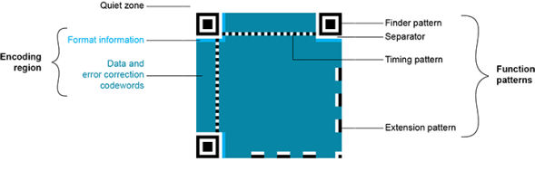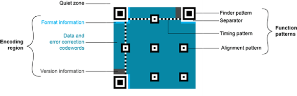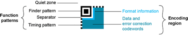QR 码符号由包含数据和纠错码字的编码区域和包含符号元数据和位置数据的功能图案组成。