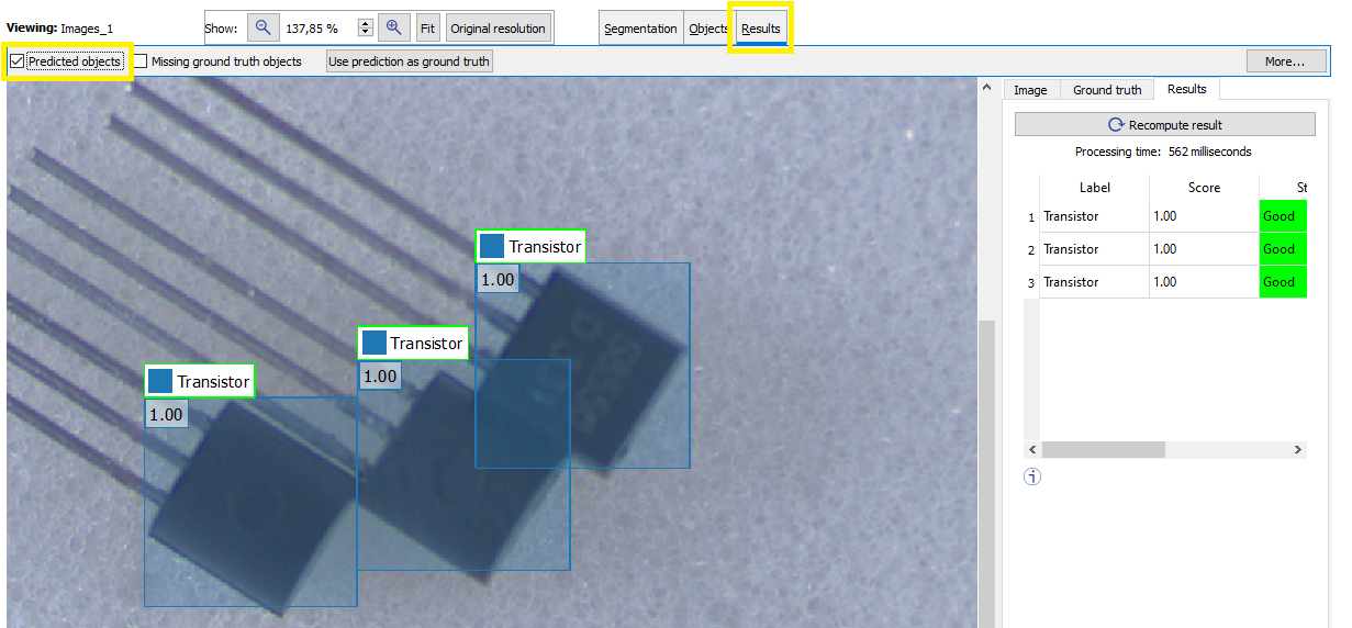 | □ | 要查看预测对象与真实值对象的接近程度,请在图像右侧的列表中选择该对象。 |