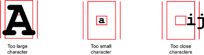- MaxCharWidth、MaxCharHeight:この寸法の長方形内に入らないブロブは文字と見なされず(大きすぎる)、除外されます。 さらに、この寸法の長方形内に複数のブロブがある場合、それらはまとめてグループ化されて一つの文字を形成します。 外側の長方形サイズは、小さい安全マージンで拡張して、フォントの中で最も大きい文字が収まるように選択する必要があります。