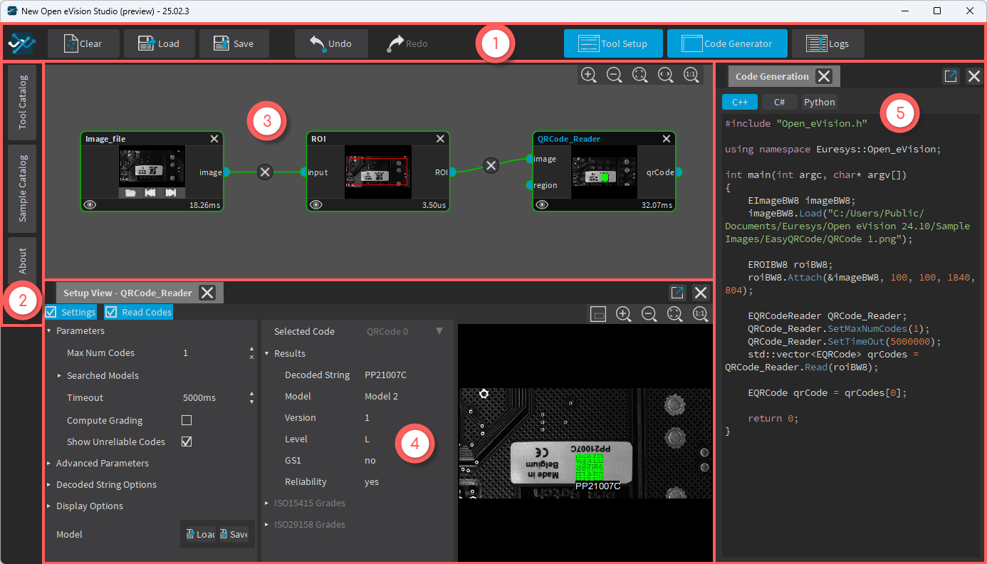 The new Open eVision Studio graphical user interface (GUI) is organized as follows: