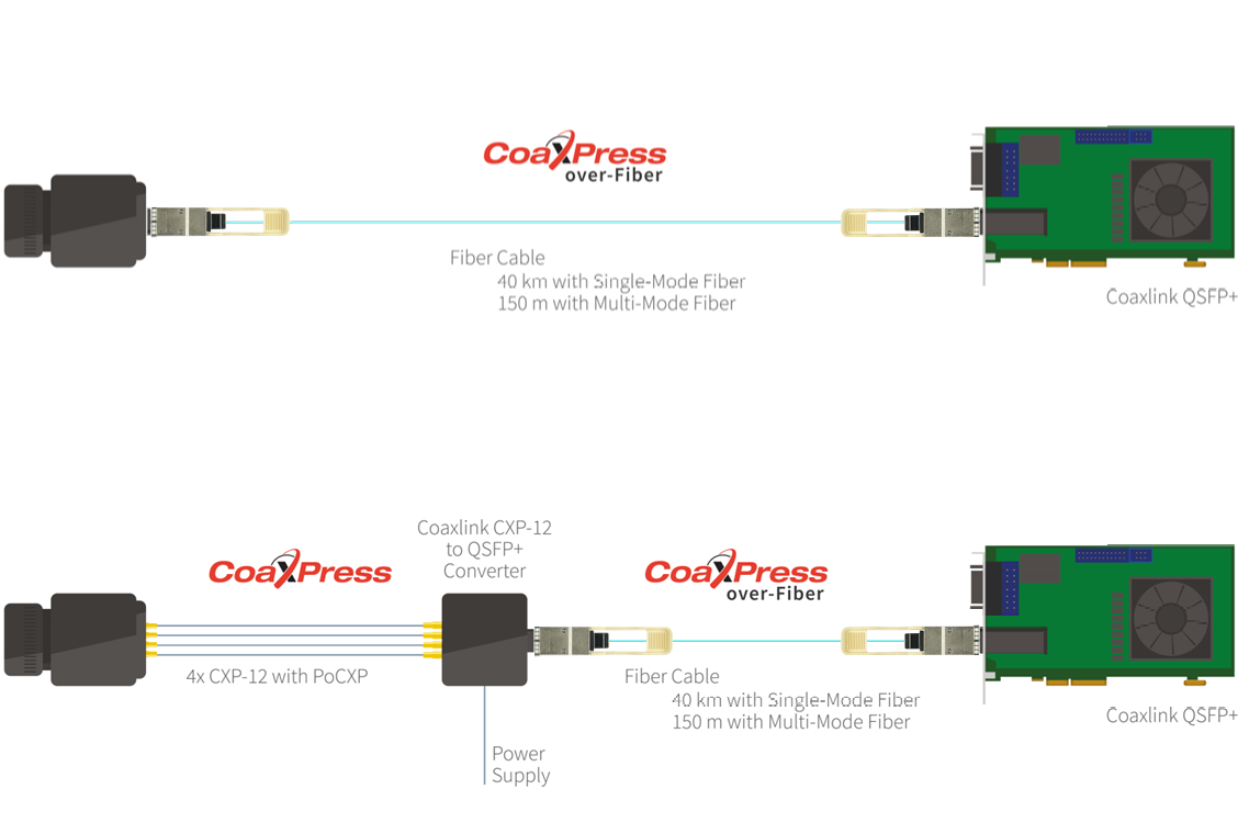 There are two fiber solutions to go beyond the maximum lengths of coax cables. The first one is a system fully based on the CoaXPress-over-Fiber standard where both camera and frame grabber are compliant with the standard and interconnected directly via fiber. The second solution is via a converter that can interface a CoaXPress camera based on coax cables to a CoaXPress-over-Fiber frame grabber. Both solutions allow us to use the full range of fiber cable lengths, going from few meters to tens of kilometers.