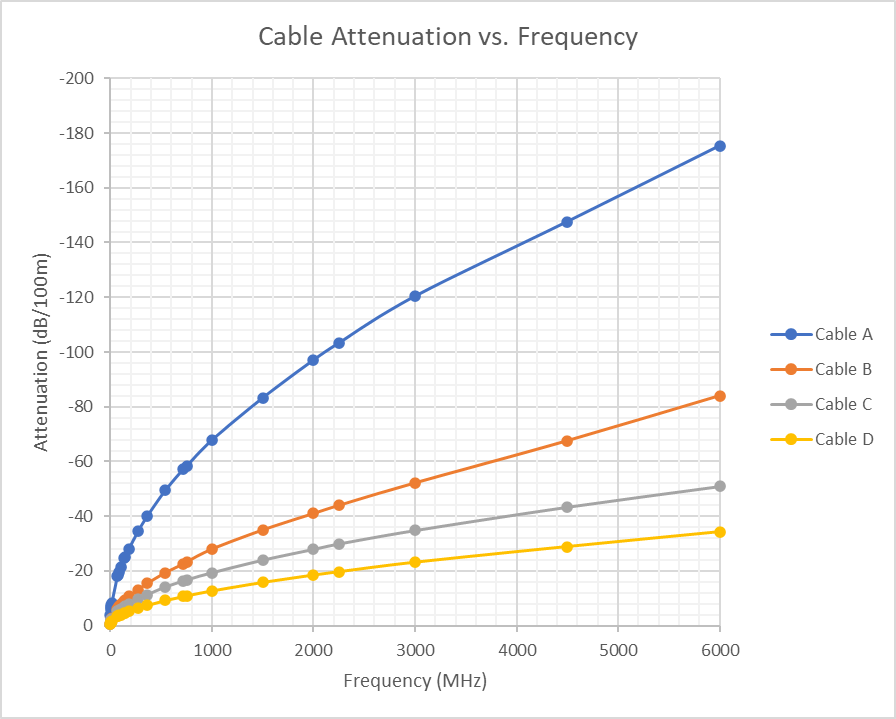 In the graphic below we can see typical Attenuation vs. Frequency curves from four different cables targeting the same application domain. These curves are usually provided by the cable makers where the attenuation is measured at the frequencies used in the target application domain of the cable.