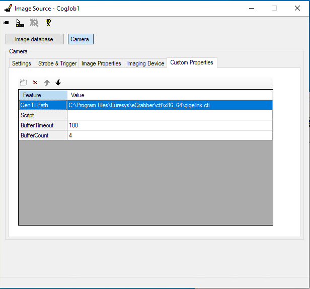 The Custom Properties pane allows to read and write values to Features. These features are not GenICam features, but some parameters used in the context of the eGrabber adapter for Cognex VisionPro.