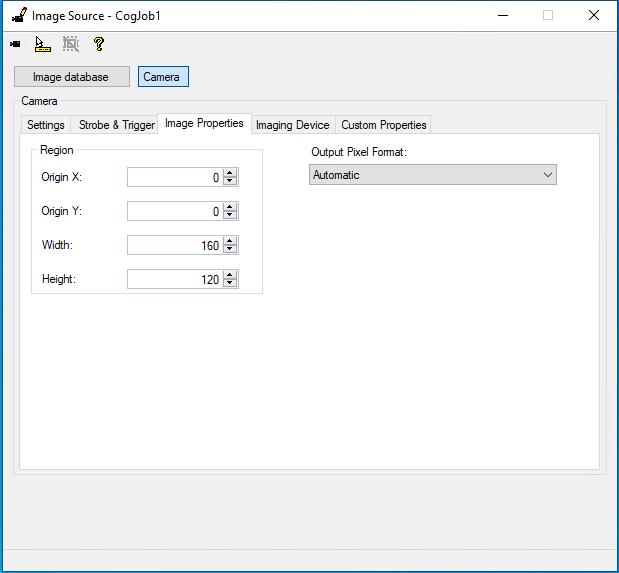The Image Properties pane allows to configure the output format of the image to be used after the acquisition in Cognex VisionPro. In this pane, only the image Width and Height can be configured. It is also possible to choose the Output Pixel Format. Both the change of the pixel format value and the resizing of the acquired image are done by the software, with no interaction from the frame grabber.