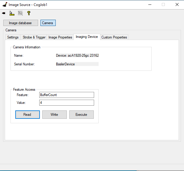 The Imaging Device pane allows to retrieve and configure Features. These Features can also be seen and configured in the Custom Features pane (read below for the list of available features). The user can write the desired feature and then click Read to obtain its value, or click on Write to change its value. The Execute button is not supported and must not be used, because there is not any executable feature.