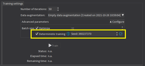 In Deep Learning Studio, the option to use deterministic training and the random seed are available in the advanced parameters. |