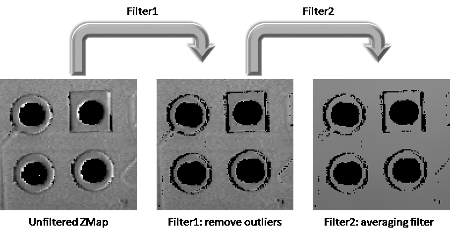 | □ | 此应用程序计算有关内核窗口中所有有效点的中心点的高度偏差,如果得到的高度偏差超过30μm(请参阅代码中的),则此应用程序会移除内核窗口中心像素(事实上,会把它替换为0,即未定义的像素)。 |