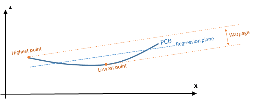 In this application, we define the warpage as the difference between the highest and the lowest surface points when the PCB regression plane is oriented horizontally. In other words, we fit a plane through the PCB points and take the perpendicular distance between the highest point above and the lowest point below this regression plane.